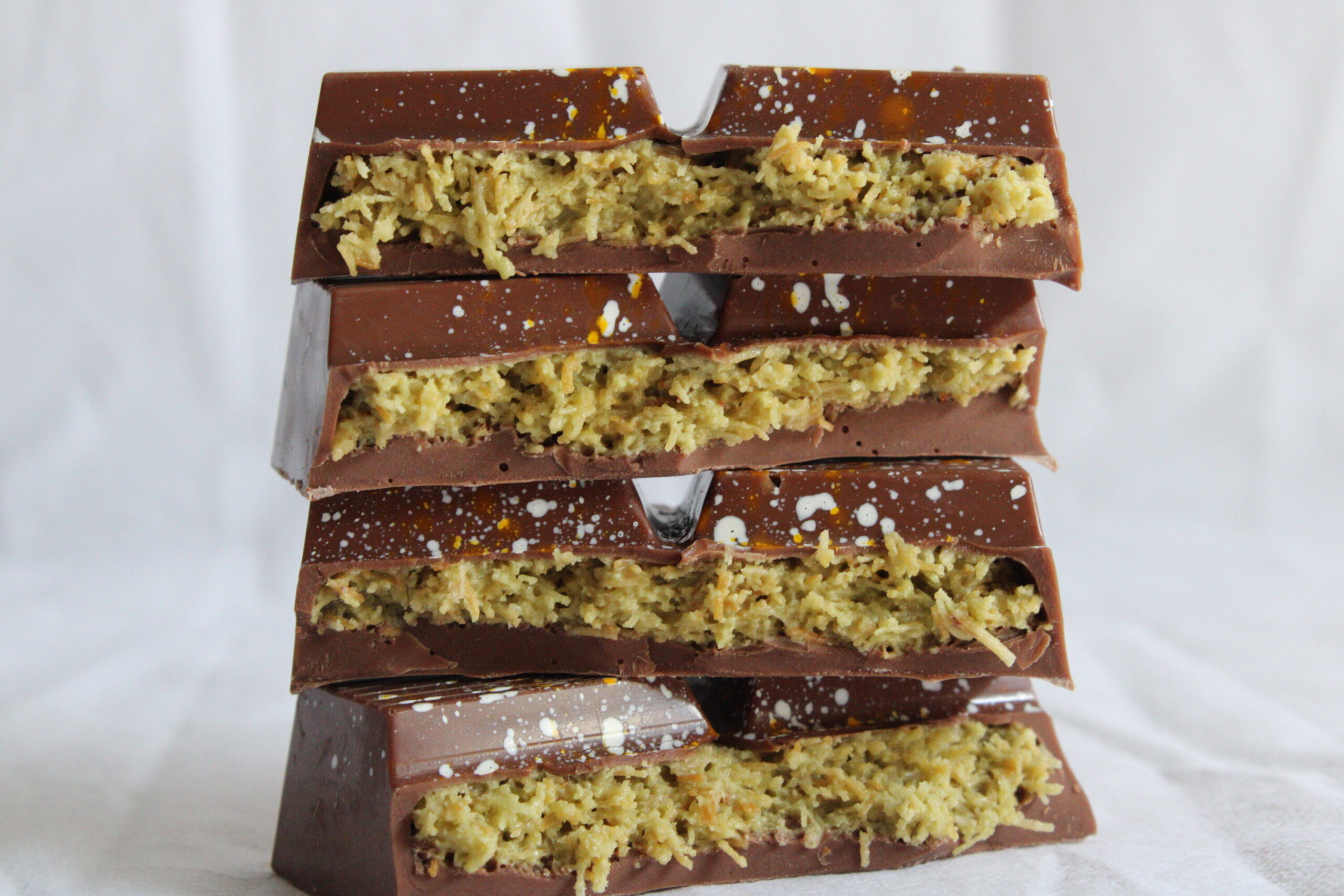 Pistachio and kataifi filling coated in milk chocolate. A perfectly balanced blend of nutty textures and subtle spices for a sophisticated, indulgent bite.