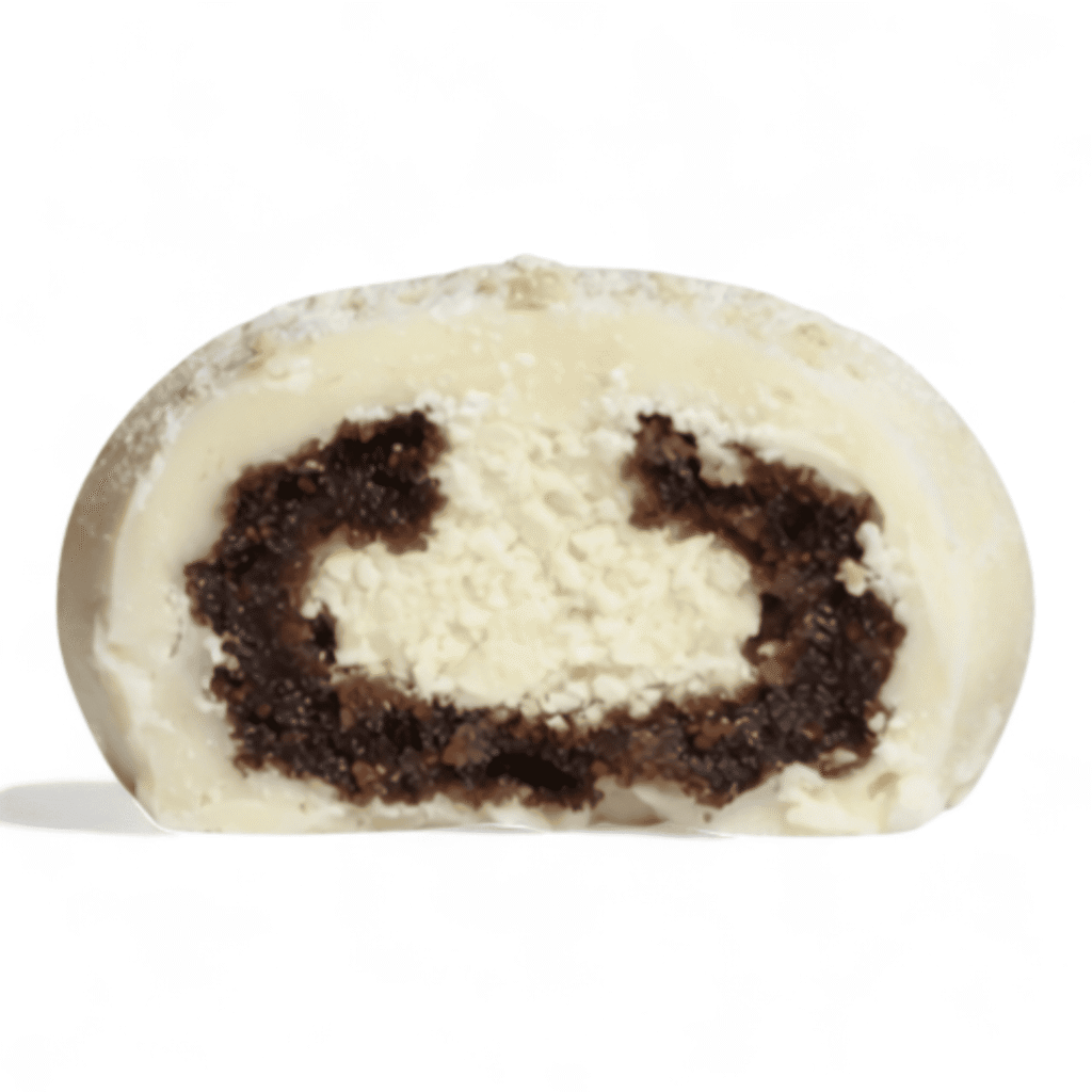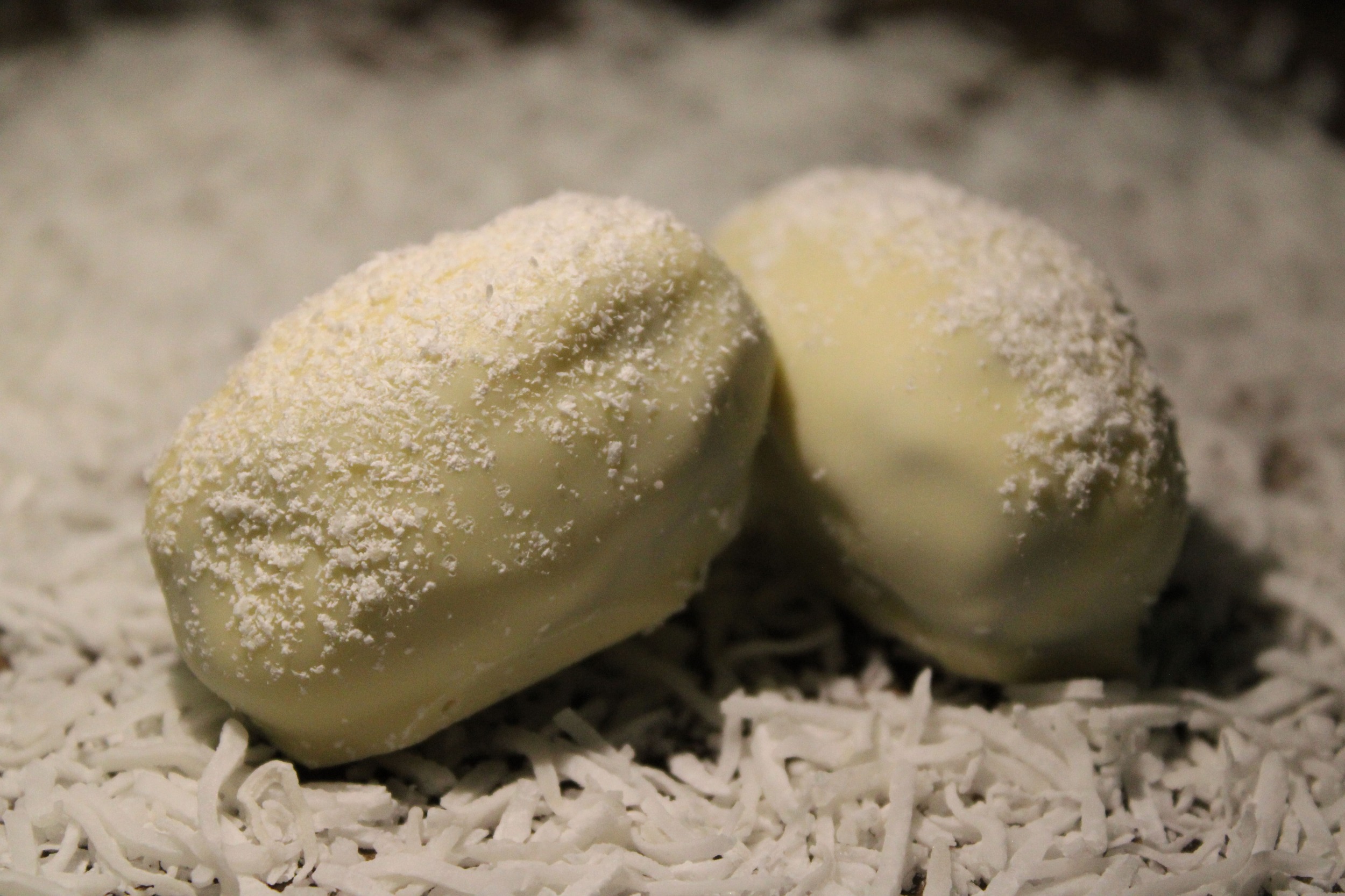 Coconut filling coated in white chocolate and lightly sprinkled with toasted coconut to create a snowy effect. Tropical, crunchy, and velvety-smooth in every bite.