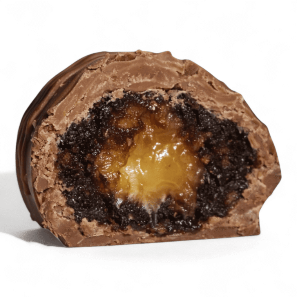 A soft caramel centre enrobed in smooth milk or dark chocolate, offering a classic, melt-in-the-mouth delight with subtle sweetness.