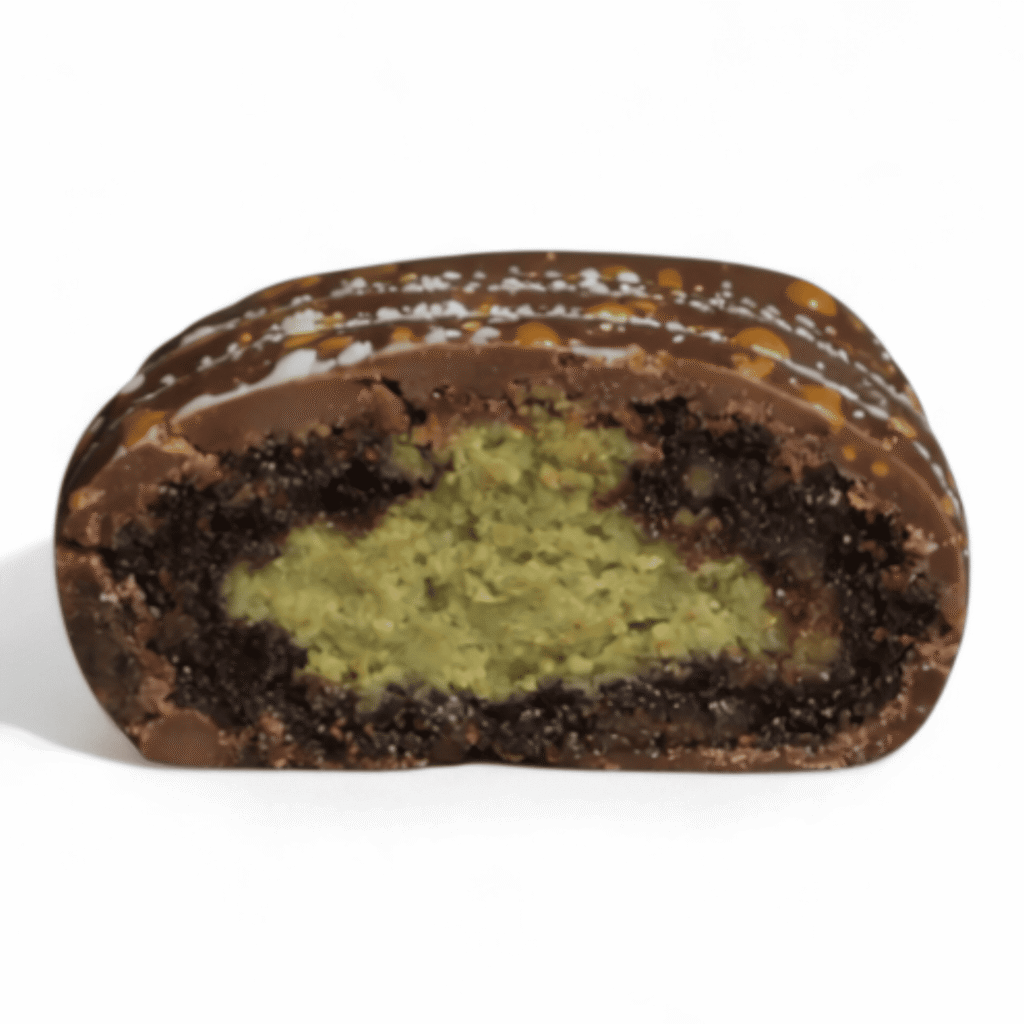 Pistachio and kataifi filling coated in milk chocolate. A perfectly balanced blend of nutty textures and subtle spices for a sophisticated, indulgent bite.