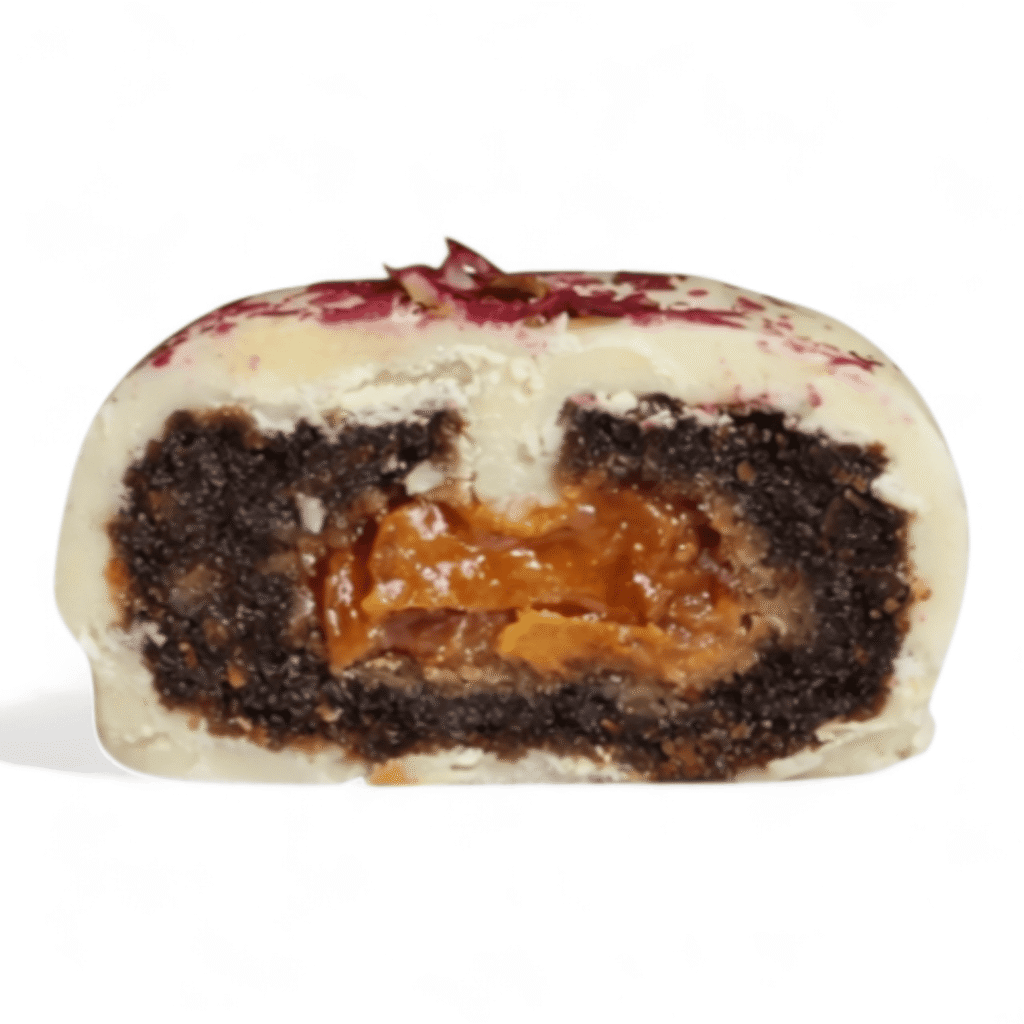 Candied orange filling coated in white chocolate and topped with edible rose petals. Bright citrus notes paired with creamy chocolate for an elegant and aromatic experience