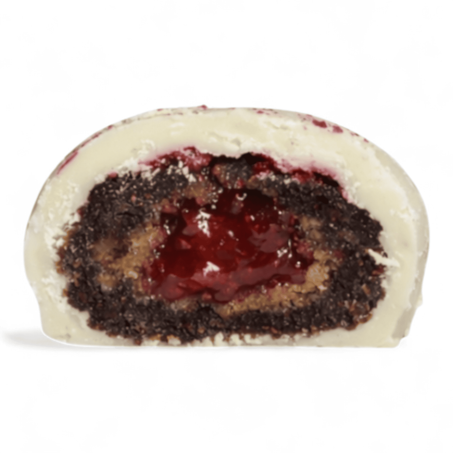 Tangy raspberry filling enveloped in white chocolate. The contrast between tartness and sweetness creates a delicate, refined taste experience.